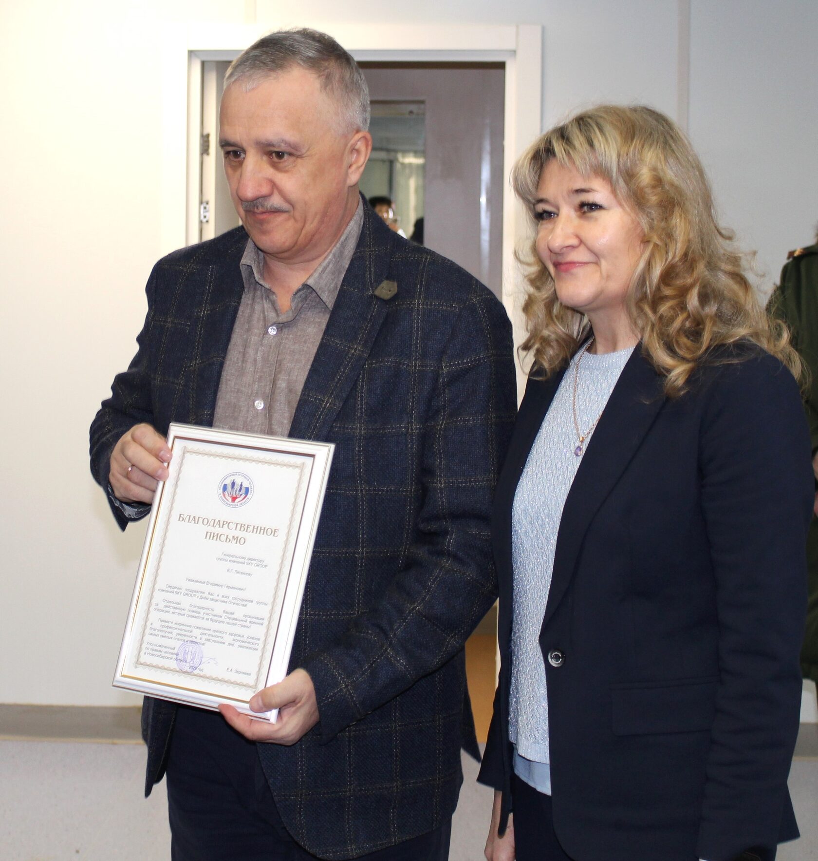 Елена Зерняева выразила благодарность ГК «SKY GROUP» и президенту компании Владимиру Литвинову за активную жизненную позицию, неравнодушие и реальную помощь жителям региона. Она также вручила Владимиру Германовичу «Благодарственное письмо» за действенную поддержку участникам СВО.
